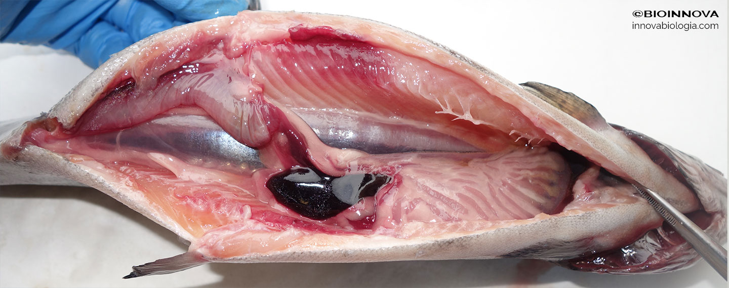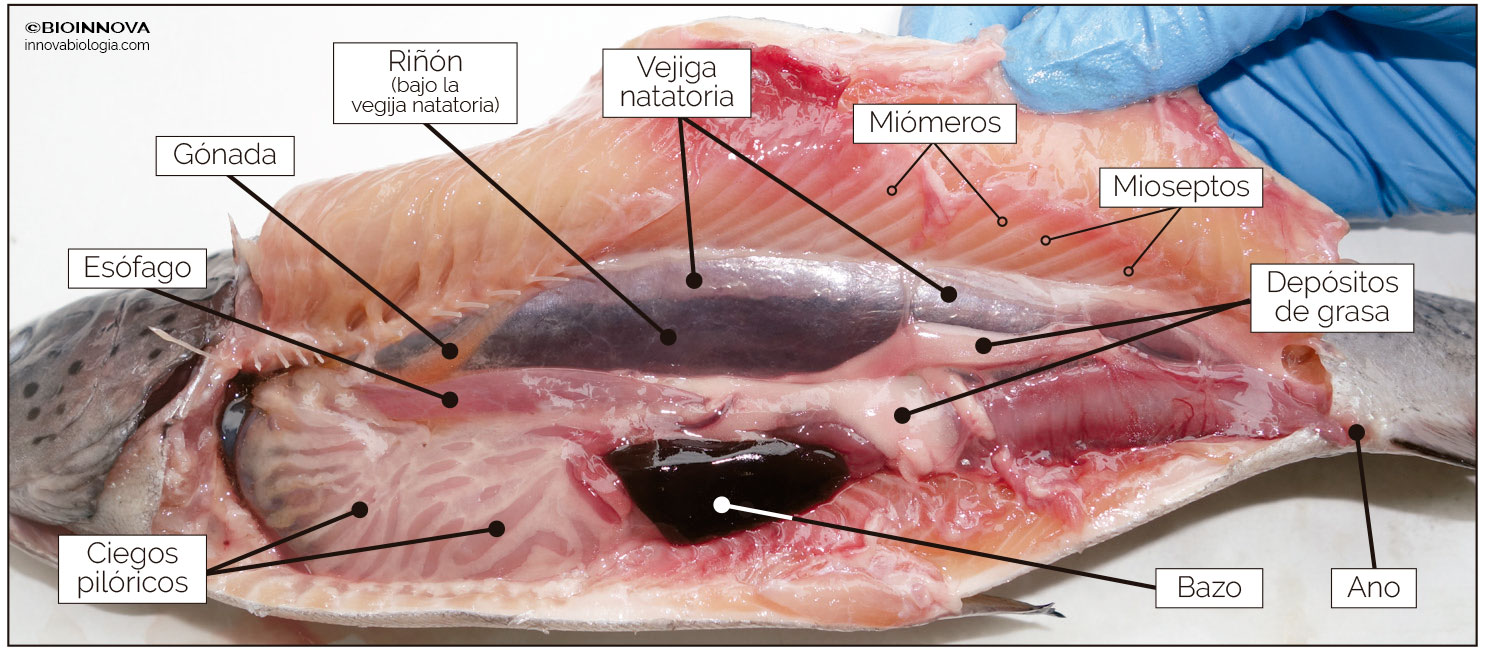 Para estudiar la anatomía interna de la trucha y poder observar los distintos órganos del animal, es necesario abrir cuidadosamente el cuerpo para acceder a todas las estructuras que alberga el celoma. Para ello, con la ayuda de unas tijeras, cortaremos longitudinalmente en la parte ventral del pez, hasta llegar a la altura de la barbilla, bajo el opérculo. Aunque en este punto ya se puede observar la cavidad interior, para facilitar su estudio se pueden hacer también dos cortes transversales desde los extremos del corte longitudinal y hacia la línea lateral, abriendo así una amplia ventana en el cuerpo del individuo. El celoma está dividido en un gran abdomen, que contiene las principales vísceras, y una pequeña cavidad pericárdica situada bajo los arcos branquiales, que contiene el corazón.