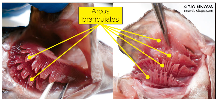 Las branquias, vistas al levantar el opérculo, aparecen como cuatro órganos semicirculares y rojos, cada uno llevando una doble fila de filamentos branquiales libres. Alternando con las branquias se encuentran las cinco hendiduras branquiales alargadas y verticales que se abren en la faringe. La presencia de branquias en lugar de pulmones constituye uno de los rasgos principales que separan a los peces de los vertebrados superiores.