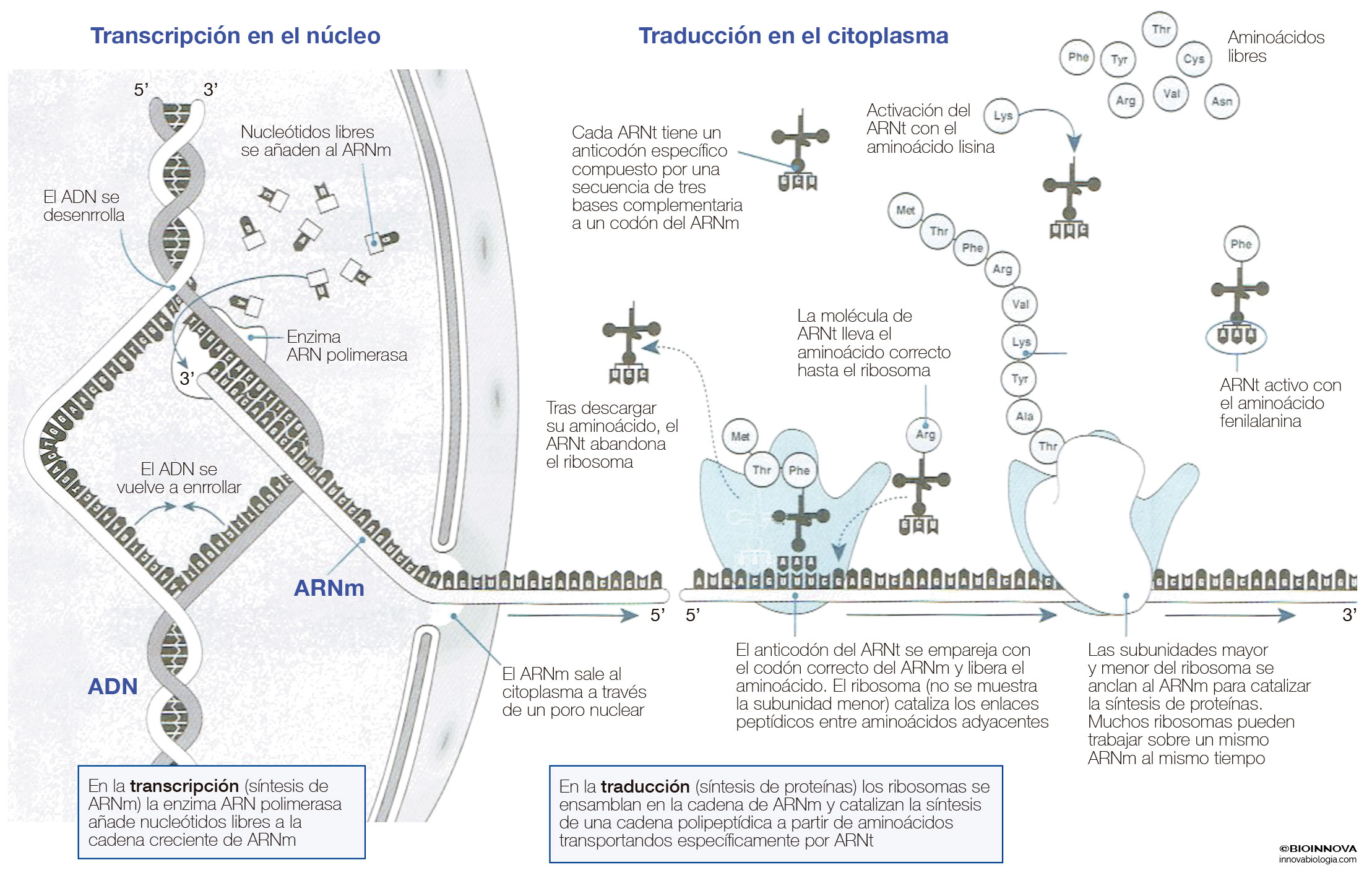 En las células eucariotas la transcripción tiene lugar en el núcleo y la traducción en el citoplasma. En el primer paso del proceso de expresión génica, una secuencia de bases del ADN debe ser transcrita al ARNm complementario. Este ARNm primario sufre un proceso de maduración (caperuza en 5’, cola poli-A en 3’ y splicing) y sale hacia el citoplasma a través de algún poro nuclear. Los ribosomas del citoplasma traducen la secuencia de ARNm y sintetizan un polipéptido enlazando aminoácidos en el orden especificado por dicha secuencia. Esta polimerización se da gracias a los ARNt, que contienen regiones anticodón complementarias a los codones del ARNm y que llevan hasta los ribosomas los aminoácidos requeridos, siguiendo el código genético.