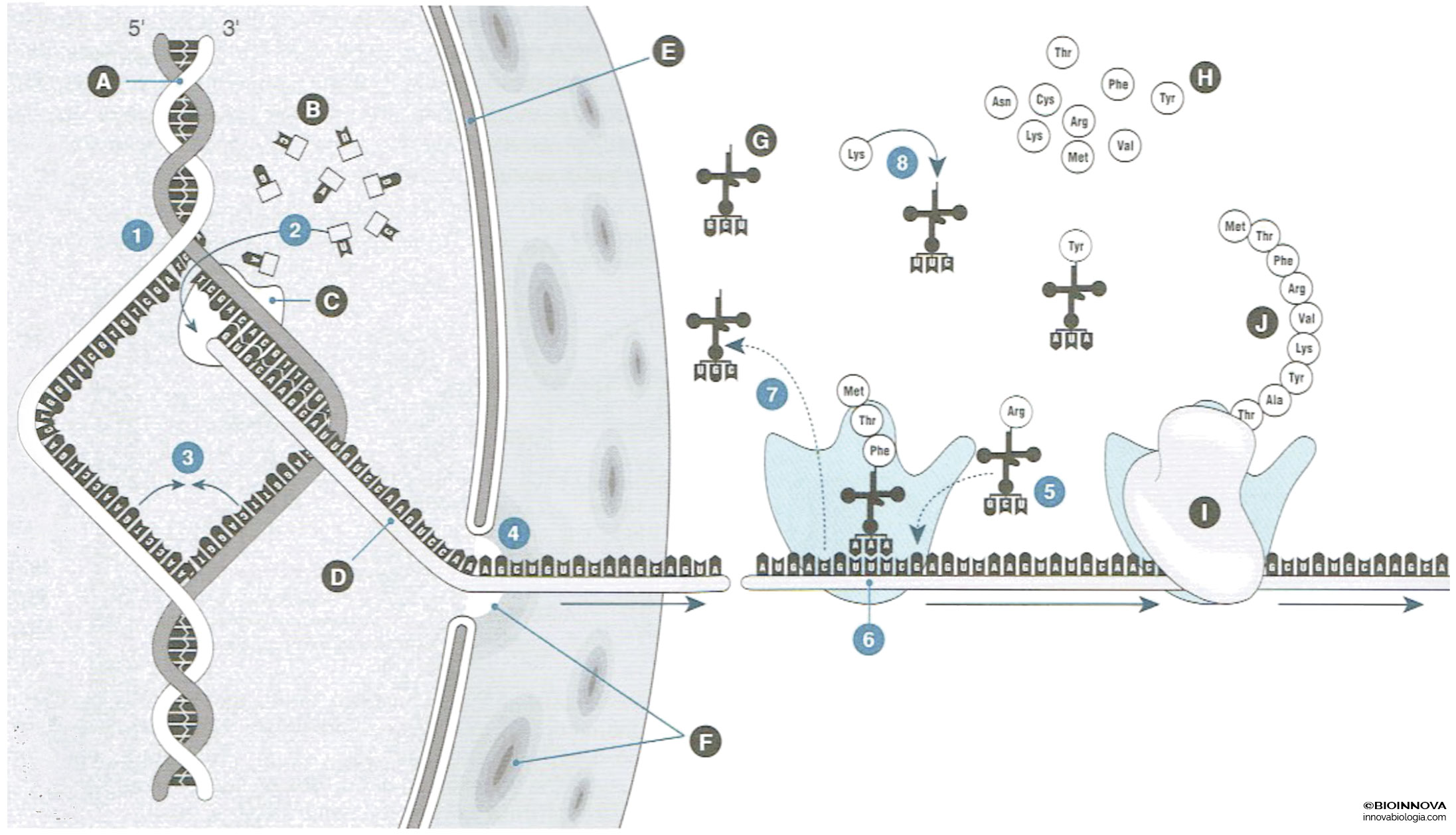 El esquema sobre estas líneas representa una visión global del proceso de síntesis de proteínas. Los pasos más relevantes están numerados, mientras que las estructuras participantes están señaladas con letras. En base a la información disponible en esta y otras chas relacionadas, responda a las siguientes preguntas.