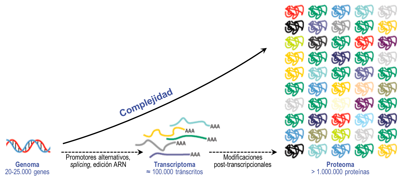 Se proporciona asimismo una visión de la complejidad del estudio del proteoma en comparación con el análisis de genoma, dado que, por ejemplo en humanos, se estima que a partir de los 25.000–30.000 genes que codifican proteínas en el genoma, podrían generarse un número de proteínas diferentes que oscilaría entre 500.000–1.000.000.