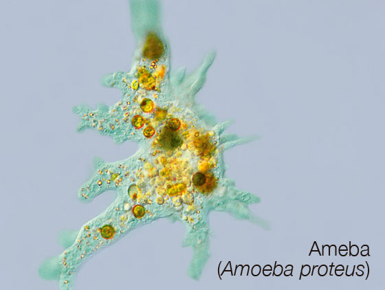 Los animales de agua dulce (izquierda) tienen fluidos corporales osmóticamente más concentrados que el agua en la que viven y son todos osmorreguladores. El agua tiende a entrar en sus tejidos por ósmosis y debe ser expulsada para evitar que inunde el cuerpo. Los protozoos simples (como la ameba, derecha) utilizan vacuolas contráctiles para recoger el exceso de agua y expulsarlo.