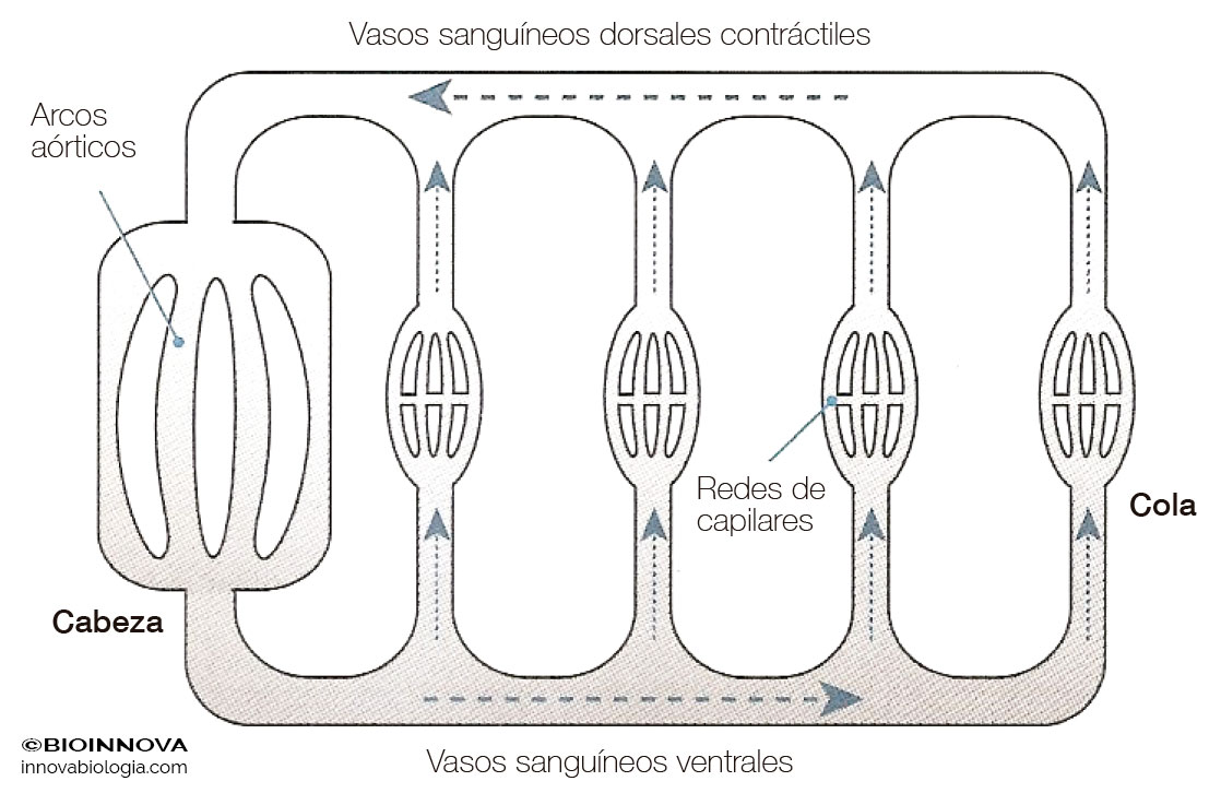 Los sistemas cerrados de muchos anélidos hacen circular la sangre a través de una serie de vasos, antes de devolverla al corazón. En estos organismos, los vasos sanguíneos dorsales y ventrales están conectados por vasos laterales en cada segmento. El vaso dorsal recibe la sangre de los vasos laterales y la lleva hacia la cabeza. El vaso ventral transporta la sangre hacia atrás y la distribuye a los vasos segmentarios. El vaso dorsal es contráctil y es el principal método de propulsión de la sangre, pero también hay varios arcos aórticos contráctiles (“corazones”) que actúan como órganos accesorios para la propulsión de la sangre.