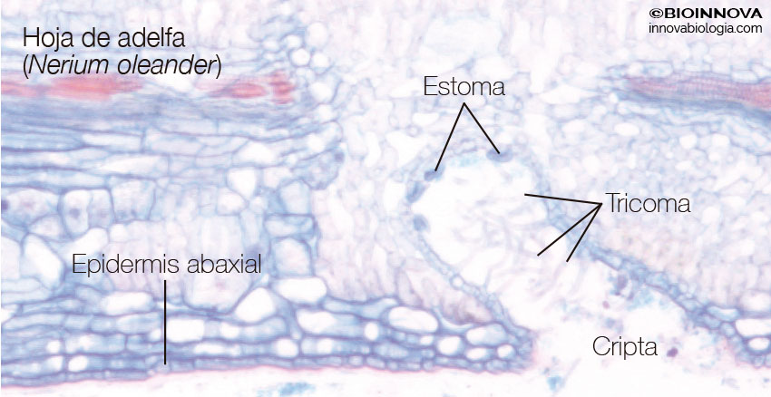 La adelfa es una planta xerófita capaz de conservar muy bien el agua. Sus estomas se encuentran ubicados en el fondo de criptas (estoma foveolado) en el envés de las hojas. Estas restringen la pérdida de agua en mayor medida de lo que reducen la entrada de CO2.